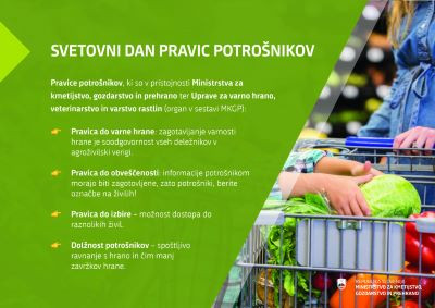 Ali kot potrošniki poznamo svoje pravice? Predvsem pa - svoje dolžnosti? V nadaljevanju izpostavljamo pravice potrošnikov, ki so v pristojnosti Ministrstva za kmetijstvo, gozdarstvo in prehrano ter Uprave za varno hrano, veterinarstvo in varstvo rastlin (organa v sestavi MKGP).Danes obeležujemo svetovni dan pravic potrošnikov