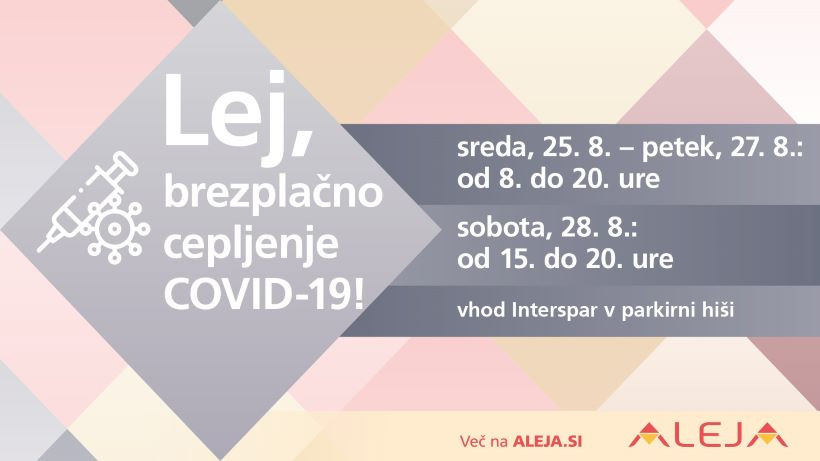 Nakupovalno središče Aleja v tem tednu organizira brezplačno cepljenje proti COVID-19 v parkirni hiši, od danes, 25. avgusta, do petka, 27. avgusta, od 8. do 20. ure ter v soboto, 28. avgusta, od 15. do 20. ure.