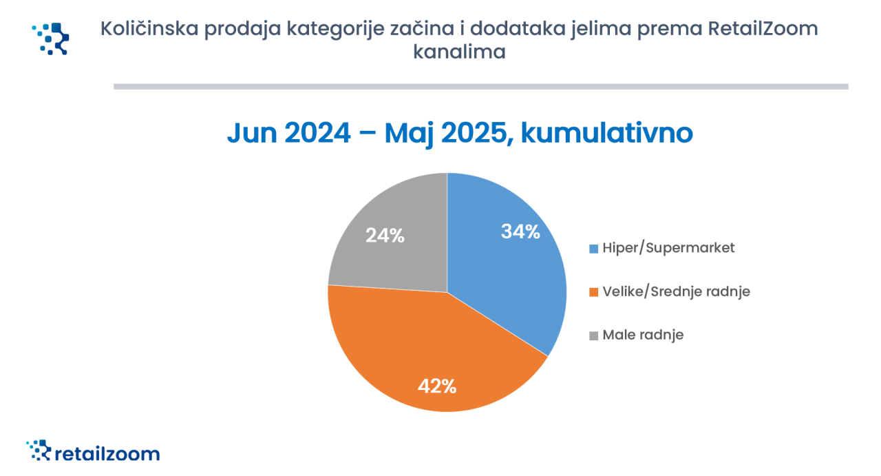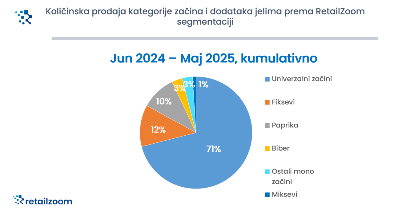 Podaci kompanije RetailZoom se odnose na količinsko i vrednosno učešće začina i dodataka jelima na maloprodajnom tržištu Srbije, u periodu od juna 2024. do maja 2025. godine, dakle proteklih godinu dana.