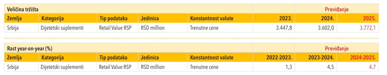 Prema prognozama, sama raznovrsnost dijetetskih suplemenata, dostupnih u Srbiji, podsticaće potrošačku potražnju u narednim godinama. Dijetetski suplementi mogu se koristiti za jačanje opšteg zdravlja i podizanje imuniteta, ali će se spektar benefita proširiti u narednom periodu. Prognozira se da će proizvodi koji unapređuju nekoliko aspekata zdravlja postati šire dostupni.