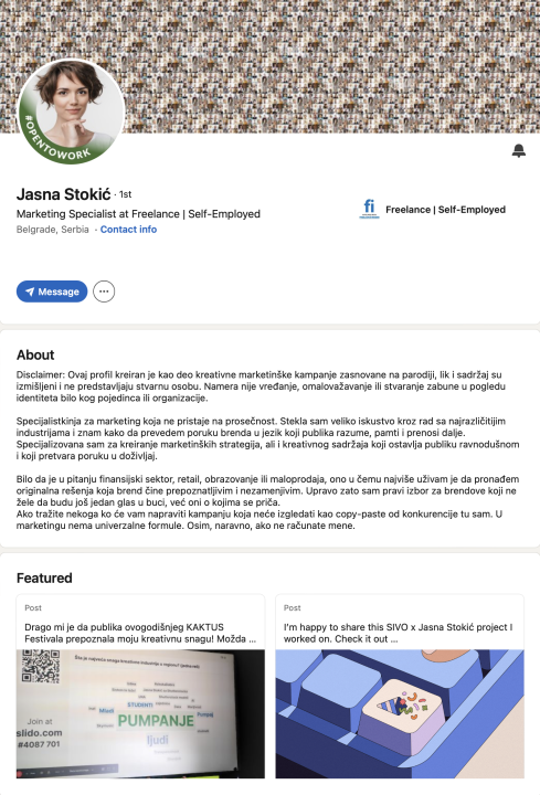 Sa ciljem da ukažu na rastući problem korišćenja generičkih oglasnih rešenja, za koja se brendovi sve češće odlučuju, kreirali su LinkedIn profil pod imenom Jasna Stokić. Na njen profil stigli su pozivi za konekcije od strane stručnjaka iz reklamne industrije, dok su postovi na temu kampanja u kojima je učestvovala dobili brojne impresije.