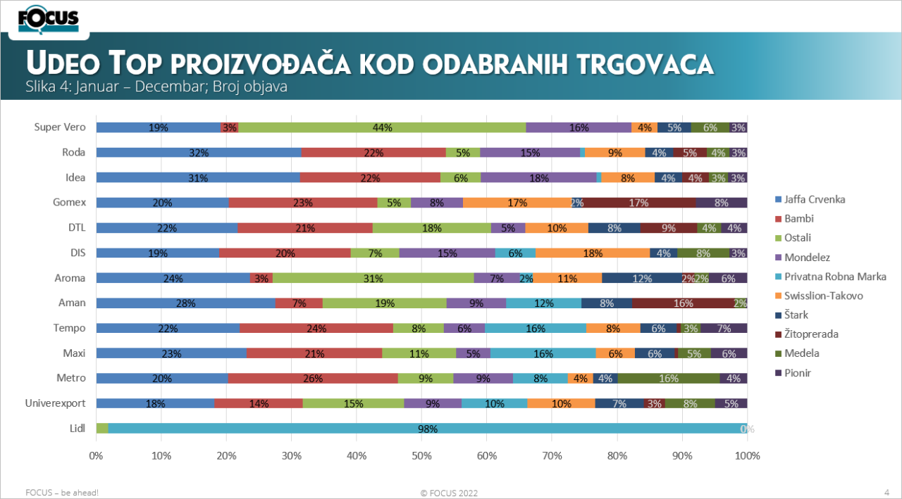 Četvrti dijagram donosi prikaz oglašavanja Top proizvođača kod odabranih trgovaca, iz kojeg možemo da zaključimo da je to oglašavanje veoma različito. Najveći vrednosni udeo, više od 30%, imala je Jaffa Crvenka i to kod trgovaca Roda i Idea. Bambi je imao svoj najveći udeo kod Metroa i Tempa. Mondelez, sa 18%, kod Idee, Swisslion kod DIS-a, Štark sa 12% kod Arome, Žitoprerada sa 17% kod Gomexa, a Medela kod Metroa. Pionir ima udeo u rasponu od 3% do 8% kod raznih trgovaca. Privatne robne marke vrednosno je najbolje oglašavao Lidl, sa 98% udela od totala svih oglašavanih proizvoda u kategorijama raznog keksa i biskvita.